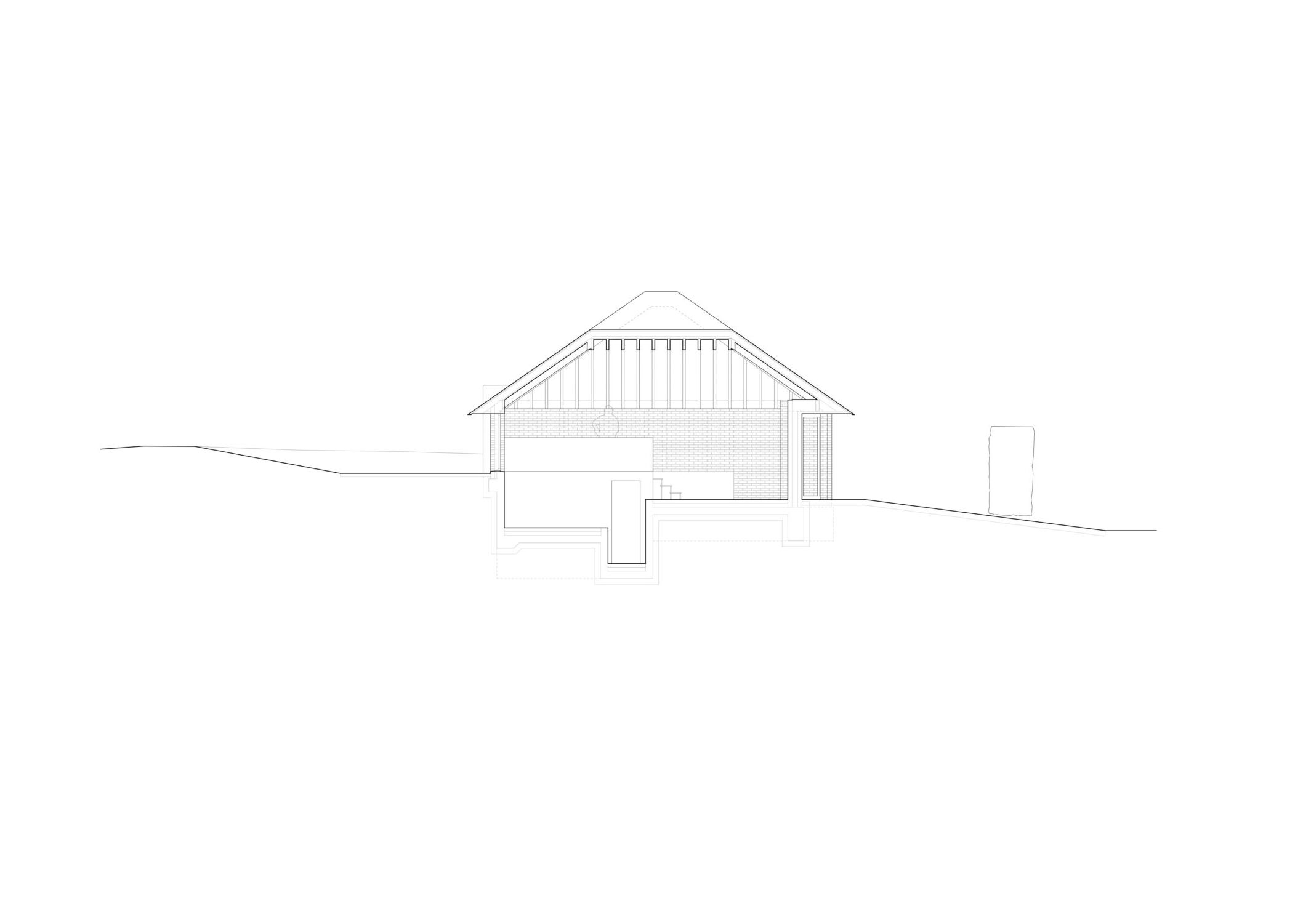Nestling on the bank of the existing site, the proposal for the house is a compact studio living concept, organised by creating an interior terracing that mimics the existing landscape levels. Hidden under an overhanging roof structure that references the idea of the contextual bungalow form.